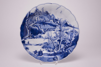 Bord op voetring, geschulpte rand. Versierd in onderglazuur blauw met een berglandschap met een rivier en bomen, een bootje met een persoon op het water. Op de oever twee personen en diverse huizen in de bergen. Vogels in de lucht. Op de rand een blauwe lijn als kader. Op de achterkant vier maal gestileerde bamboebladeren. Onder op de bodem een merk in een dubbele cirkel. (Nederlands)