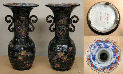 Grote porseleinen vaas met aangelijmde houten oren, Japans, 2e helft 19e eeuw, 55 cm hoog, bedekt met zwart lakwerk en een echt mooie, ingelegde voorstelling in parelmoer, Van Diepencollectie, JMD-P-3117 |