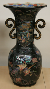 Grote porseleinen vaas met aangelijmde houten oren, Japans, 2e helft 19e eeuw, 55 cm hoog, bedekt met zwart lakwerk en een echt mooie, ingelegde voorstelling in parelmoer. Helft van een stel. Zie jmd-p-1317. (Nederlands)