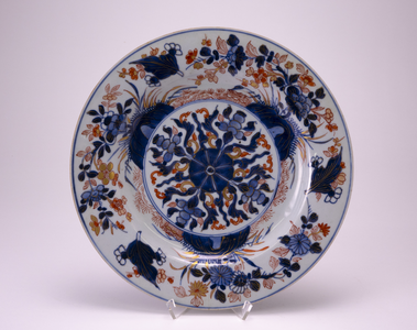 Chinese Imari dubbelbord met op het plat een rozet met bloemen en artemisiablad. Op de rand bloemtakken afgewisseld met bladeren.(k'ang hsi)