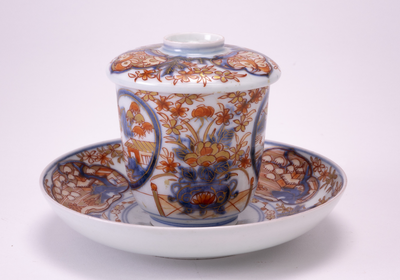 Japanse Imari chocoladekop met schotel en deksel, motief van bloemen en vruchten in dubbele cartouche omgeven rievierlandschappen in gecontourneerde perken.