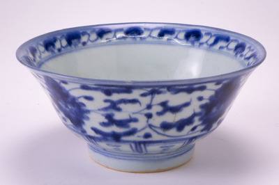 Blauw wit gedecoreerde rijstkom met gestileerde bloemen op de buitenzijde en de binnenrand.