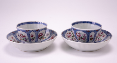 Blauw gedecoreerd chinees schoteltje met op de binnenzijde diverse cartouches, met hierin polychoom gedecoreerde bloemen.