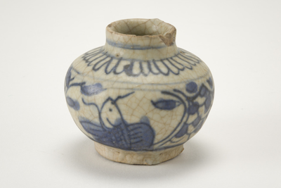 Klein bolvormig potje met korte smalle hals. Blauw gedecoreerd met rond de hals bloemblaadjes en rondom op de buitenzijde blauw gedecoreerd met twee springende karpers en twee velden met schubben. Geheel onder een matte glazuurlaag. De boden is ongeglazuurd. (Nederlands)