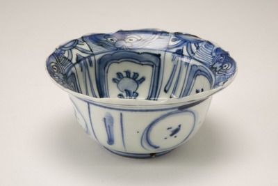 Klapmuts kom van porselein met een geschulpte rand, beschilderd in onderglazuur blauw. In de binnenrand . De binnenwand is verdeeld in vier brede vakken met een perzik- of bloemtak in een geschulpt cartouche; daartussen vier smalle vakken met strikken. De binnenrand met dezelfde cartouches op servetwerk; de smalle vakken met vier T`ao t`ieh maskers. De buitenwand met vier medaillons met stippen en vier smalle vakken. Enkele chips in de rand. Kraakporselein in blauw-wit. (Nederlands)