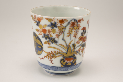 Witte Imari beker zonder oor met op de buitenzijde twee maal een vaas met bloemen en twee maal een blauwe cirkel met goudkleurige bloemen. In de kleuren blauw, ijzerrood en goud. (Nederlands)
