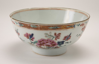 Amsterdams bont kom op standring met bruine lip. Langs de binnenrand twee ijzerrode lijnen. Op de buitenzijde, een een band in ijzerrood en goud met famille rose bloemen. Hieronder vier famille rose bloemdecoraties. (Nederlands)