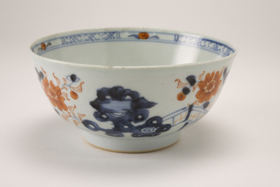 Imari kom op standring. Aan de binnenzijde langs de rand een blauwe band met vier ijzerrode bloempjes. Op de bodem een bloempje. De buitenzijde gedecoreerd met een hekwerk, een tuinrots en diverse bloemen in blauw, ijzerrood en goud. (Nederlands)