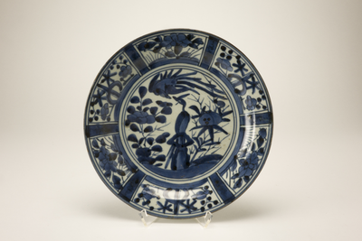 Blauw wit bord met op het plat vogels en bloemen. De rand verdeeld in zes velden met grof geschilderde bloemen. Zie; mededelingenblad van de vrienden van ceramiek No.101/102 blz 41. (Nederlands)