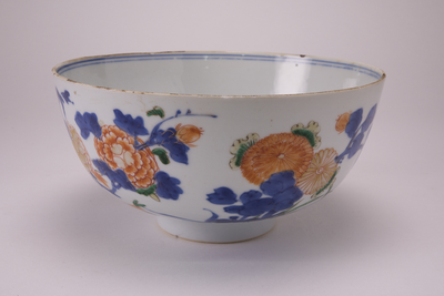Grote Imari kom met op de bodem een bloemdecor. Langs de binnenrand twee blauwe lijnen. Op buitenzijde grote oranje-blauwe bloemdecors met pioenen en chrysanten. Ch'ien-lung