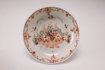 Schotel, Chinees porselein, met in Holland aangebrachte beschildering, Amsterdams bont, in rood, blauw, groen en goud, 18de eeuw. Plat: een een rijkversierde hengselmand en bloemversieringen. Rand: een guirlande versiering in ijzerrood en zwart. (Nederlands)