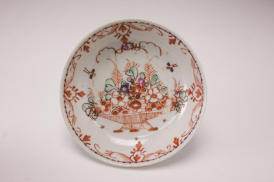 Schotel, Chinees porselein, met in Holland aangebrachte beschildering, Amsterdams bont, in rood, blauw, groen en goud, 18de eeuw. Plat: een een rijkversierde hengselmand en bloemversieringen. Rand: een guirlande versiering in ijzerrood en zwart. (Nederlands)