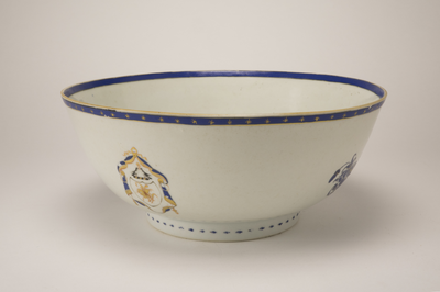 Grote witte chinese kom met langs de randen blauw met gouden banden. Op de bodem en op de buitenzijde twee blauw met gouden bloemdecoraties en twee maal een baldakijn met daarin een wapenschild met een goudkleurige bloemversiering. Boven het wapen twee vogeltjes op een balk met gezamenlijk een bloemtakje in de snavel (engels). (Voor de Amerikaanse markt vervaardigd) (Nederlands)