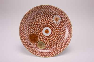 Schotel met aan de binnenzijde een ijzerrood schulpdecor met hierin vier cirkelvormige(chrysant) versieringen. Herkomst China, gemaakt voor de Japanse markt. (Nederlands)