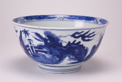 Bowl on footring, spreading rim. Decorated in underglaze blue with a sitting kylin, a Fo-dog and another mythical animal with hooves, a dragon’s head and a bushy tail sitting by a fence. Inside around the rim a band with groups of pine needles, inside on the base a hare and bamboo. On the base the four-character mark Yadetang zhi (made for the hall of elegant virtue). (Engels)