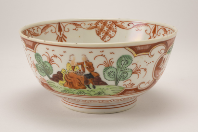 Amsterdams bont kom met langs de binnenrand een ijzerrode guirlandeversiering. Op het plat een hengselmand. Op de buitenzijde, een decoratie met een Europees paar en een appelplukker op een ladder. (Nederlands)