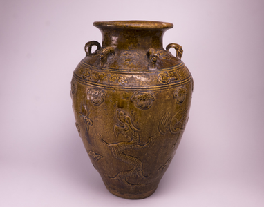 Grote martavaan met okerbruine glazuurlaag en in reliëf drakendecors. Rondom decor van een draak die de parel van welvaart achterna zit. Op de schouder voorzien van lussen om de bovenkant af te dichten. (Nederlands)