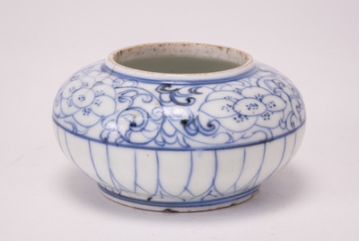 Klein plat penseelpotje zonder deksel met fijn blauw lijndecor. De bovenste helft een rondom een bloemdecor. De onderste helft bestaat uit rondom aangebrachte blaadtjes. (Nederlands)
