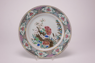 Wit rond bord met op het plat een famille rose pioendecor met een dikke bruine tak, bamboebladeren en een prunustak. Op de rand een Famille rosedecor met acht uitsparingen waarin pioenrozen zijn aangebracht. (Nederlands)