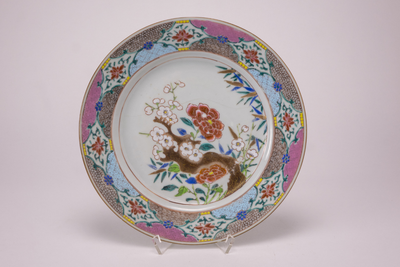 Wit rond bord met op het plat een famille rose pioendecor met een dikke bruine tak, bamboebladeren en een prunustak. Op de rand een Famille rosedecor met acht uitsparingen waarin pioenrozen zijn aangebracht. (Nederlands)