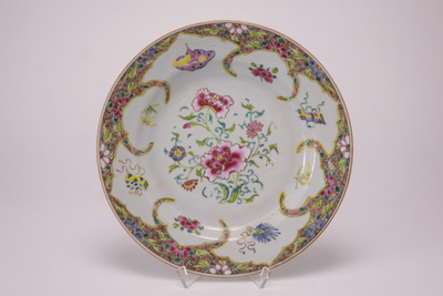 Famille rose bord met op plat bloemtakken met pioenrozen. Op de rand een Famille rosedecor met acht uitsparingen waarin bloemen en antiqiteiten zijn aangebracht, Van Diepencollectie, JMD-P-2405 |