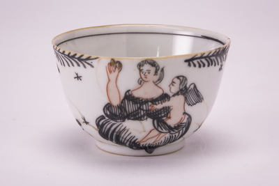 Witte kommetje met langs de rand en op de buitzijde grove decoraties in zwart, roze en goud. Op de buitzijde een wolk met een persoon, een vrouw met een engeltje op schoot. In Nederland nagedecoreerd ? (Nederlands)