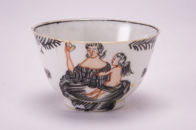Witte kommetje met langs de rand en op de buitzijde grove decoraties in zwart, roze en goud. Op de buitzijde een wolk met een persoon, een vrouw met een engeltje op schoot. In Nederland nagedecoreerd ? (Nederlands)
