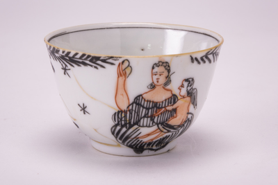 Witte kommetje met langs de rand en op de buitzijde grove decoraties in zwart, roze en goud. Op de buitzijde een wolk met een persoon, een vrouw met een engeltje op schoot. In Nederland nagedecoreerd ? (Nederlands)