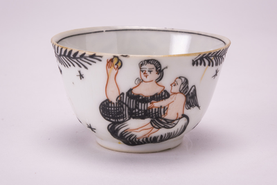 Witte kommetje met langs de rand en op de buitzijde grove decoraties in zwart, roze en goud. Op de buitzijde een wolk met een persoon, een vrouw met een engeltje op schoot. In Nederland nagedecoreerd ? (Nederlands)