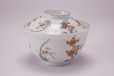 Witte Kakiemon dekselkom met op de buitenzijde en op het deksel fijne meerkleurige bloemen- en plantendecors, Van Diepencollectie, JMD-P-2466 |