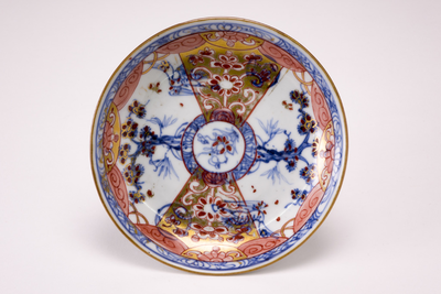 Amsterdams bont schotel met op het plat twee witte vlakken met een blauwe boom en twee goudkleurige vlakken met bloemen. Langs de rand een blauwe bandmet ijzerrode guirlande, Van Diepencollectie, JMD-P-2503 |
