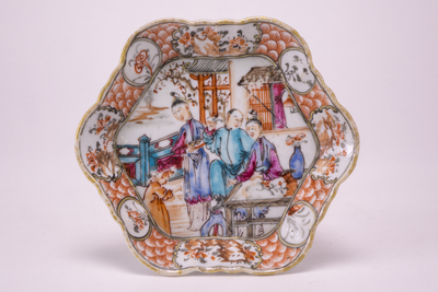 Zes hoekige patipan met op de bodem een veelkleurig Mandarijn- landschapdecor met drie volwassenen en een kind, Van Diepencollectie, JMD-P-2666