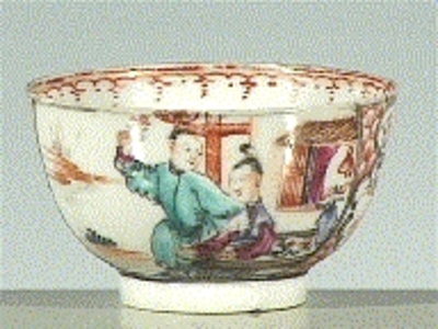 Kommetje zonder oor met op de buitenzijde veelkleurige Mandarijn- landschapdecors met o.a. drie volwassenen en een kind. De versiering is kenmerkend voor de groep die in Nederland ‘mandarijn’ genoemd wordt, verwijzend naar de naam die in het Westen aan alle Chinese ambtenaren gegeven werd. Daarbij wordt vaak paars, oranje, geel, een hard roze en bruin email toegepast, terwijl als onderwerpen meestal Chinese figuren en familietaferelen geschilderd zijn. In Groningen heet de variant met goud (zoals hier) ‘herenmandarijn’, de variant zonder goud ‘boerenmandarijn’. (Nederlands)