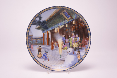Veelkleurig bord met op het plat een groot gebouw met goud groenkleurige bovenzijde. Hiervoor op het bordes chinese personen met vuurwerk en een sneeuwpop. "Het Lampionnenfeest" (Nederlands)