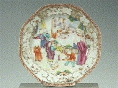 Schoteltje met op het plat veelkleurige Mandarijn- landschapdecors met o.a. drie volwassenen en een kind. De versiering is kenmerkend voor de groep die in Nederland ‘mandarijn’ genoemd wordt, verwijzend naar de naam die in het Westen aan alle Chinese ambtenaren gegeven werd. Daarbij wordt vaak paars, oranje, geel, een hard roze en bruin email toegepast, terwijl als onderwerpen meestal Chinese figuren en familietaferelen geschilderd zijn. In Groningen heet de variant met goud (zoals hier) ‘herenmandarijn’, de variant zonder goud ‘boerenmandarijn’. (Nederlands)