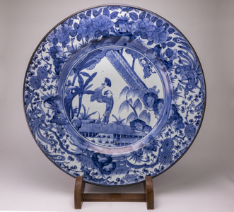 Zeer grote blauw wit gedecoreerde Arita schotel. Centraal een persoon staand met een waaier op een pad over het water, in een omheinde tuin. Rechtsboven een jongen op een schommel boven de omheining. Op de brede rand twee pauwen tussen bloemen, bloemtakken en rotsen. Zie; mededelingenblad van de vrienden van ceramiek No.101/102 blz 40. (Nederlands)