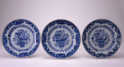 Blauw gedecoreerd Chinees Qianlong bord met op het plat een bloembak met bloemen. Hieromheen een band met kruismotief. Op de rand een wolkmotief met lotusbloemen.