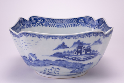 Blauw gedecoreerde chinees porseleinen vierkante Qianlong kom met geschulpte rand. Op de buitenezijde en de bodem gedecoreerd met landschappen met bergen, huizen, vogels en twee zotjes. Langs de bovenrand is een versiering aangebracht van bloemen en servetwerk. (Nederlands)
