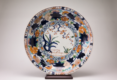 Two dishes on footring, spreading sides and rim, upturned edge. On the base six spur-marks. Imari, decorated in underglaze blue, iron-red, various shades of green, yellow and gold with banana plants and a flowering cherry tree near a fence. This is enclosed by a band with blossoming cherry sprays. On the sides an undulating foliate spray in dark blue surrounded by peonies and chrysanthemums. On the narrow rim chrysanthemums and four panels with chrysanthemums alternating with cherry blossoms. On the reverse scrolls with chrysanthemums. On the base a band with three scrolls in red. (Engels)