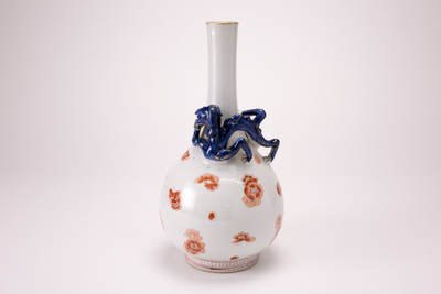 Two pear-shaped bottles on footring, long cylindrical neck. On the shoulder and curling around the neck a three-dimensional chilong in underglaze blue. Overdecorated with separate iron-red prunus flowers. Around the foot a narrow band with a fish-scale pattern. (Engels)